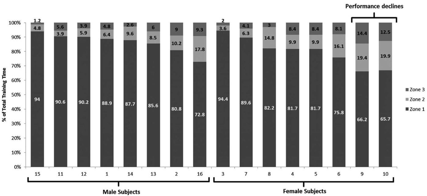 The opposite risk is perhaps even more damaging for performance-focused athletes: pushing too hard to keep up with faster teammates. Another study [10] on a youth running team found that while all athletes were given identical workouts, two runners experienced a performance decline over the study period.