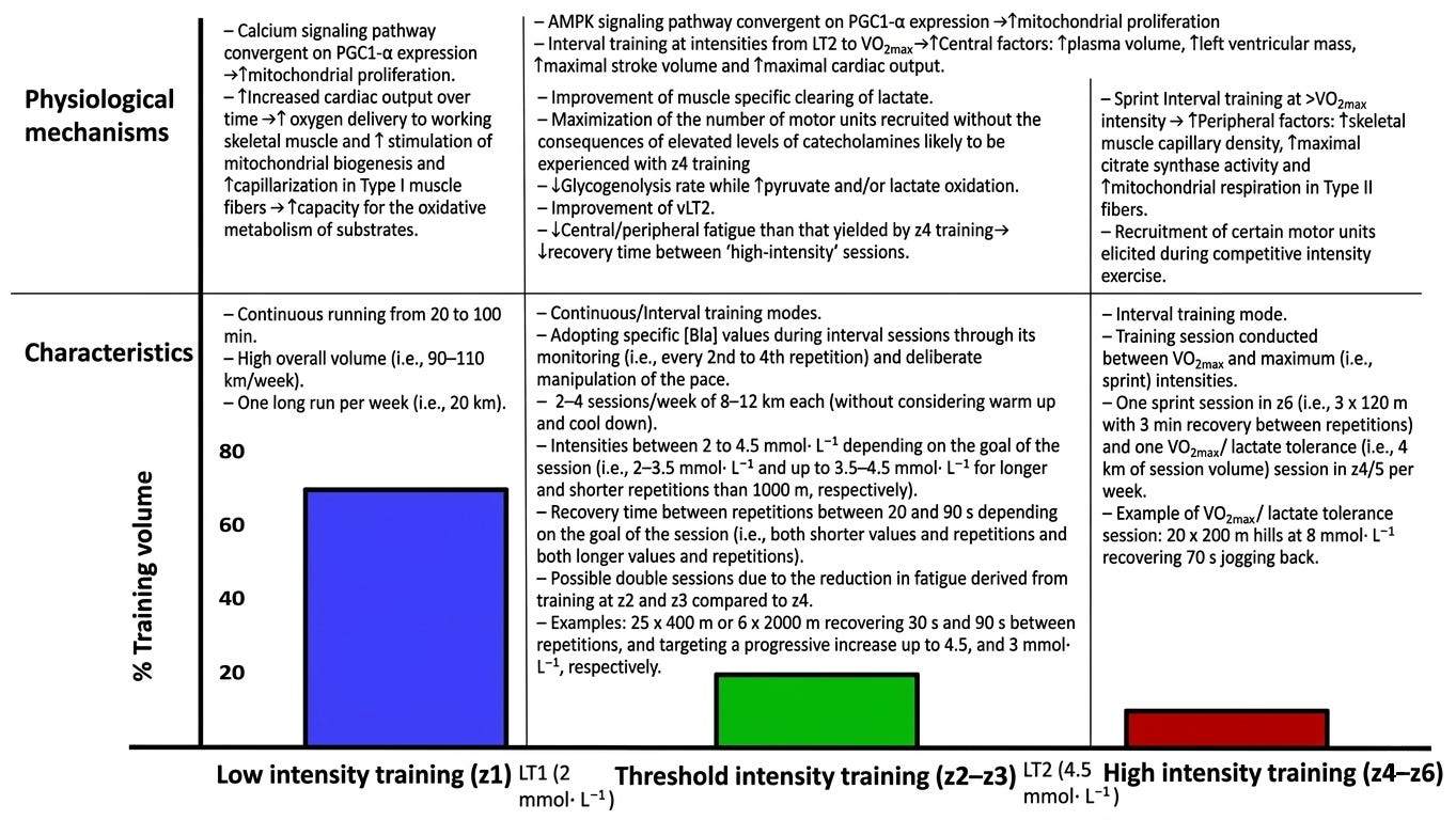 This methodology dictates that roughly 80% of training sessions are performed at an intensity below the first lactate threshold (LT1). The remaining 20% are performed at high intensity, usually above the second lactate threshold (LT2). In a standard three-zone model, this means athletes almost entirely avoid the “middle ground” of Zone 2 [2]. This pattern has also been observed across junior world-class rowers, professional road cyclists, and elite junior Norwegian cross-country skiers [3].