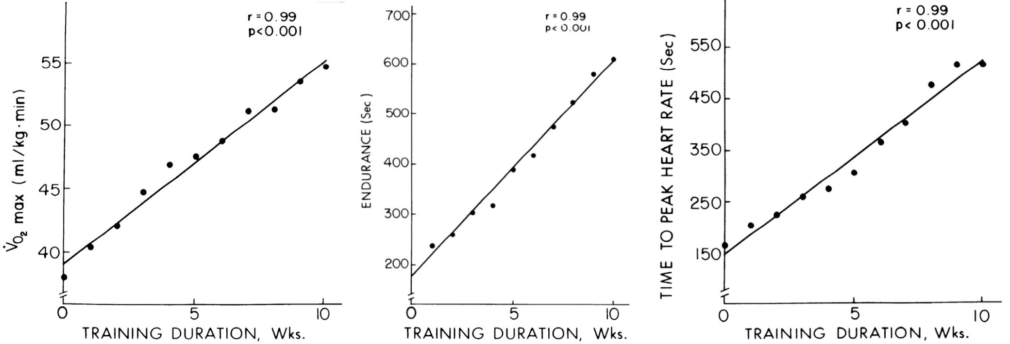 What you are seeing are the results of a landmark study by Hickson et al. (1977), where participants improved their VO2max by a staggering 44% in just 10 weeks of training [1]. Furthermore, their endurance, defined as the time they could sustain their maximum intensity, increased threefold, and their time to reach peak heart rate increased by 3.5 times. There is arguably no other documented training protocol in the world that produces such aggressive, linear results in such a short window.