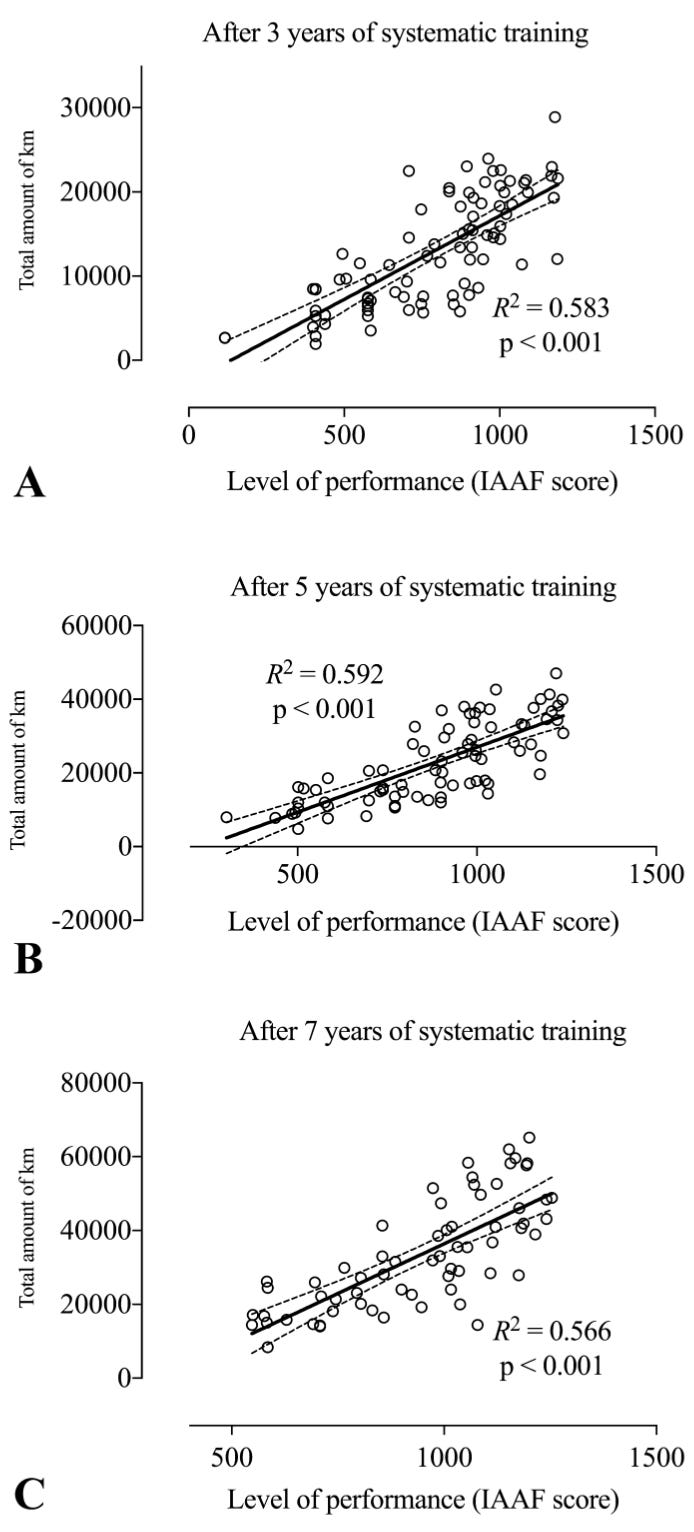 The work of Casado et al. [19] captures the central message directly in its title: “World-Class Long-Distance Running Performances Are Best Predicted by Volume of Easy Runs and Deliberate Practice of Short-Interval and Tempo Runs.” Within the study, total running distance emerged as the strongest predictor of performance, explaining up to 59% of the variability between athletes. The authors go so far as to state that there is a “fundamental need” for athletes to accumulate large training volumes, typically exceeding 100 km per week, to compete at a world-class or high national level.