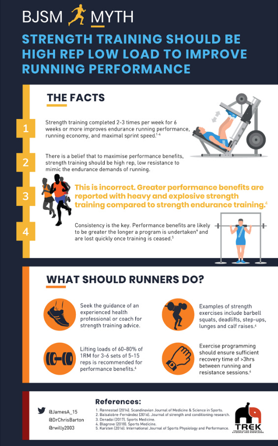Taken together, this body of evidence supports the conclusion that high-intensity strength training, when added to endurance training, can improve running economy and certain performance-related outcomes. This position is now broadly accepted within both the scientific literature and applied coaching practice, leading to generalised recommendations such as those summarised in the infographic below.