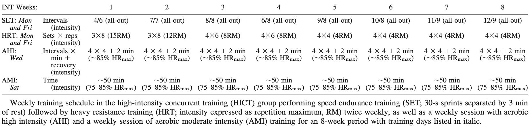 Skovgaard et al. [12] replaced 42% of weekly training volume, reducing running from 31 km per week to 18 km per week, with two strength training sessions. These sessions began with a warm-up, followed by four to twelve 30-second all-out running sprints, and concluded with heavy strength exercises focusing on the squat, deadlift and leg press. Strength training progressed from three sets of eight repetitions at manageable intensity to four sets of four repetitions at maximum intensity. Running training consisted of 4 × 4-minute intervals at heart rate zones 4 to 5 and a steady-state run of 40-70 minutes at heart rate zones 1 to 3.