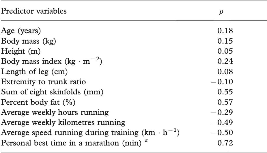To address concerns around small sample sizes and to further validate this pattern, it is useful to examine the determinants of marathon performance itself particularly given how strongly marathon ability predicts ultramarathon outcomes.