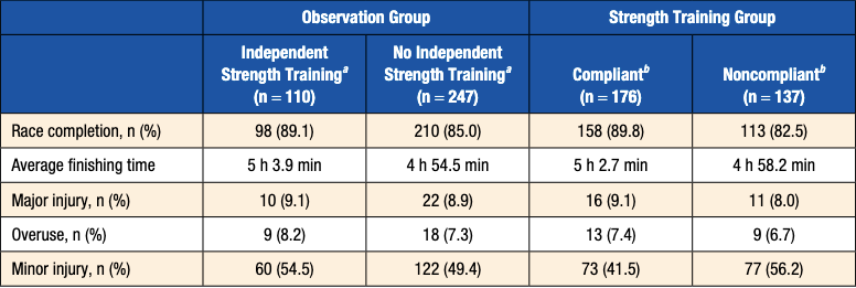 Toresdahl et al. [7] investigated the effects of strength training in a much larger cohort of marathon runners. In this study, 720 participants, with an average marathon finishing time of approximately five hours, were divided into a strength training group (352 runners) and a running-only group (368 runners). The strength group received instructions and a prescription for core, hip abductor and quadriceps strengthening exercises. The intervention did not result in a statistically significant reduction in overuse injuries leading to marathon non-completion, nor did it produce faster finishing times. Small reductions in minor injury incidence, average pain during the race and medical tent usage were observed, but none reached statistical significance.